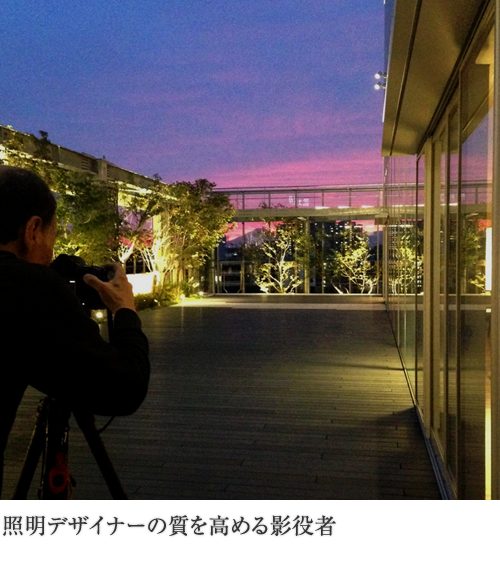 しかし、たくさんのプロジェクトの中には、プロの写真を必要とする場合もあります。たとえば、そのプロジェクトを雑誌や本に掲載するような時にはクオリティーの高い写真が求められます。最近は、カメラがデジタル化して機材も高品質な写真を撮れるものが比較的安価に手に入るようになったのですが、やはりプロの腕は全く違います。空気感といいますか、間というのでしょうか? とにかく出来栄えは、それは、それは異なるのでございます・・・。今回はそんな建築照明の写真撮影を長年に渡って手掛けていらっしゃるカメラマンの方にご同行いただいての撮影の旅となったのです。